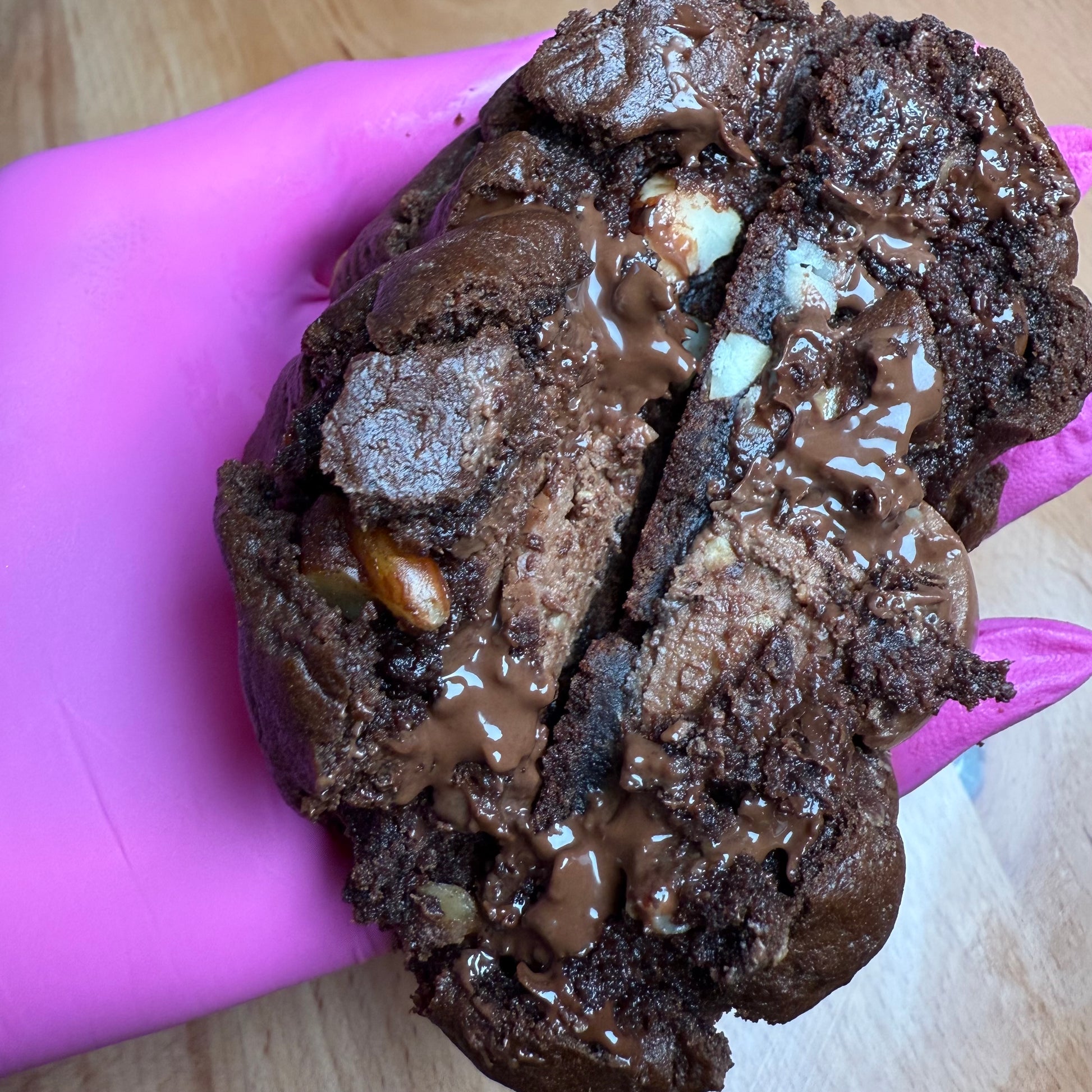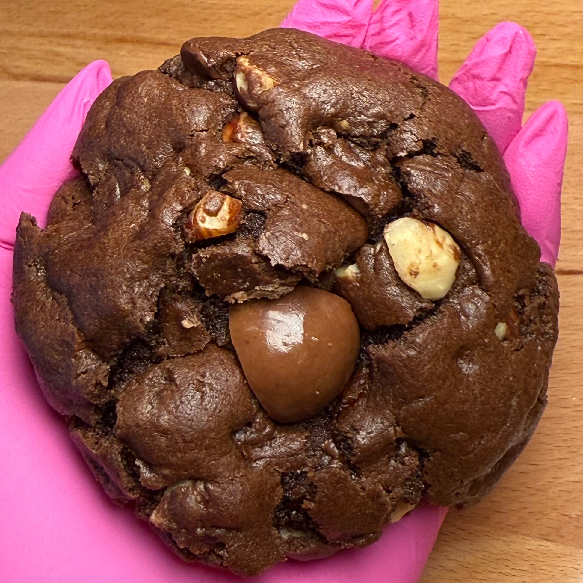 A rich chocolate cookie with toasted hazelnut chunks and dark chocolate chips, perfect for lovers of deep flavor and crunchy texture. Inside, a creamy heart of Toronto chocolate melts as it bakes. A nostalgic, indulgent treat bursting with national flavor.